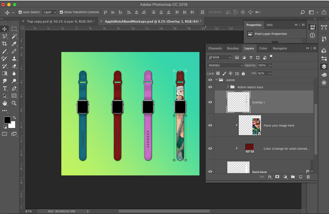 My client needed a mockup of Apple Watch bands that users could drop their own designs into. The PSD includes all of the various Apple Watch sizes (38mm, 40mm, 42mm, and 44mm) and also featured the different colors of watch faces.